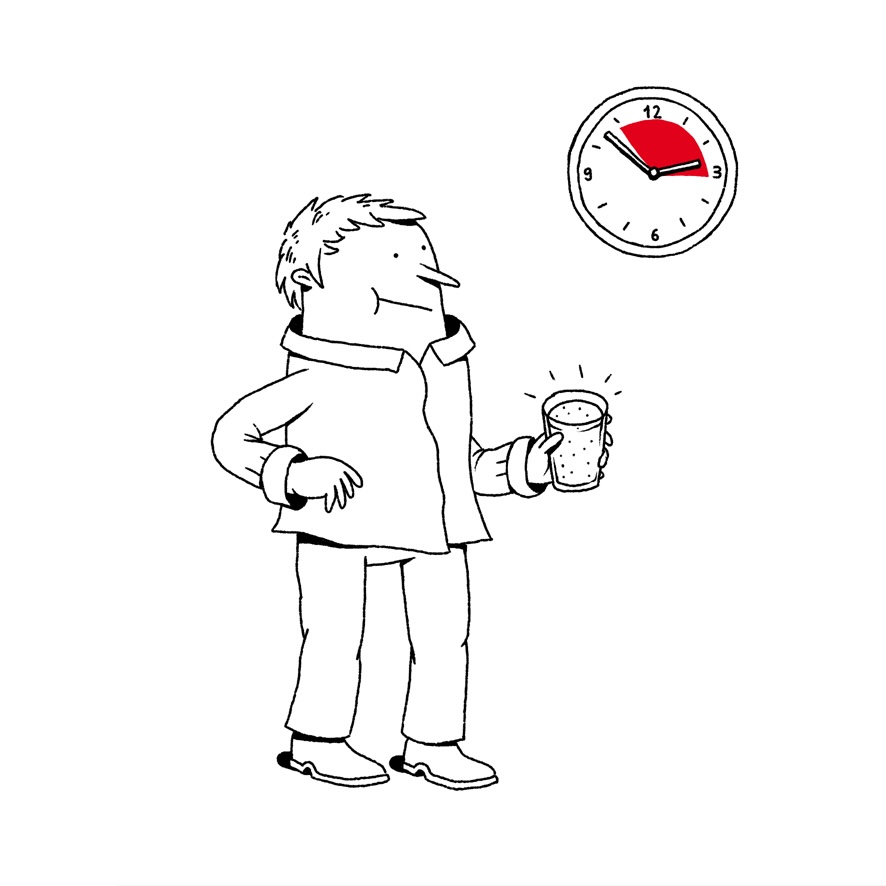 1. Sie nehmen zum ersten Mal die Darmspüllösung ein, die Sie von Ihrem Arzt erhalten haben. Ab jetzt: keine feste Nahrung mehr!