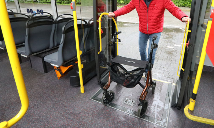 1. Stehen Sie erst auf, wenn der Bus angehalten hat. Nehmen Sie dann Ihren Rollator und fahren Sie rückwärts bis unmittelbar vor die Tür. Sie vermeiden so, dass der Rollator vornüber aus der Tür kippt. Stellen Sie dort die Bremsen fest.