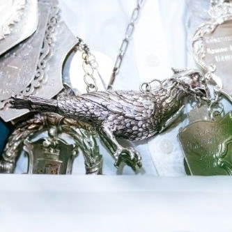 Hier ist der Krönungsball im Liebfrauenhaus in vollem Gange. Die Musik ist laut. Sie kommt abwechselnd aus der „Konserve“ oder wird live gespielt. Die Stimmung ist gut. Wer nicht das Tanzbein schwingt, hockt an einem der Tische, singt oder klönt mit dem Gegenüber. Auf der Bühne sitzt mittig Michel Welsing. Um seinen Hals hängt noch die große, schwere silberne Kette mit Plaketten und einem silbernen Vogel. Allein der ist rund 700 Gramm schwer – und alt. 1711 wurde er von Jan Wellem gestiftet. Der Kurfürst soll damals spontan am Vogelschießen der Schützenbrüder teilgenommen und gewonnen haben.