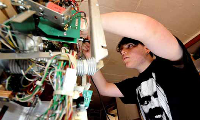 Da die mechanischen Kolosse nicht nur bestaunt, sondern auch bespielt werden, müssen sie regelmäßig auf den Behandlungstisch. Museumsgründer Harald Fleischhauer hat bereits mehr als fünfzehn Jahre Erfahrung mit seinen stählernen Patienten, ihre inneren Organe sind dem Fünfzigjährigen bestens vertraut. Tatsächlich tut sich in deren Bauch ein Wust an Relais, Spulen, Drähten, Kabeln und Kontaktbahnen auf. „So ein Flipperautomat besteht aus rund 100 Lämpchen, 30 Elektromagneten, 800 Meter Kabel, mehreren Elektromotoren, über 60 Kontakten und Hunderten von elektronischen oder mechanischen Bauteilen“, weiß Fleischhauer, der sich seit Jahren bei seinen OPs assistieren lässt: Der 2006 achtjährige Jakob Buhry entdeckte an der Seite seines Vaters bei Besuchen im Flippermuseum seine Leidenschaft für das Spiel. Und interessierte sich zunehmend auch für das Innenleben seiner elektrischen Spielgefährten. Flipperdoktor Fleischhauer nahm Jakob unter seine Fittiche, und der rückt in seinem Auftrag seitdem mit Lötkolben und Schraubendreher bewaffnet kränkelnden Geräten zu Leibe. Päppelt sie auf. Und füttert sie anschließend mit harter D-Mark.