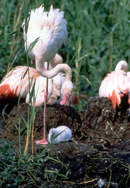 So brütet inzwischen die zweite oder dritte Generation dreier Flamingo-Arten: die zartrosafarbenen, größeren Europäischen Flamingos und die Chilenischen Flamingos mit kräftigem Rosa und roten Gelenken. Bis vor kurzem gab es einen roten Kuba- nischen Flamingo, der mit den anderen Flamingos lachsfarbene Hybriden zeugte.