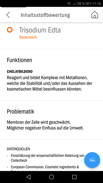 Jeder einzelne Inhaltsstoff wird ausführlich beschrieben. In dem Beispiel wurde der als bedenklich gekennzeichnete Stoff "Trisdium Edta" als Zusatzstoff ausgemacht. Er wird für ein verbessertes Aussehen des kosmetischen Mittels eingesetzt: Trisodium Edta oder auch Edetinsäure genannt, beeinflusst die Farbe und die Konsistenz des Produkts. Unter dem Punkt "Problematik" kann man nachlesen, dass der Stoff die Zellmembran schwächt. Außerdem wird auf eine mögliche Umweltschädigung hingewiesen. In Expertenkreisen ist das jedoch zum Teil umstritten, zumal es aktuell wenig gleichwertige Alternativen gibt. Screenshot (Bildschirmfoto)