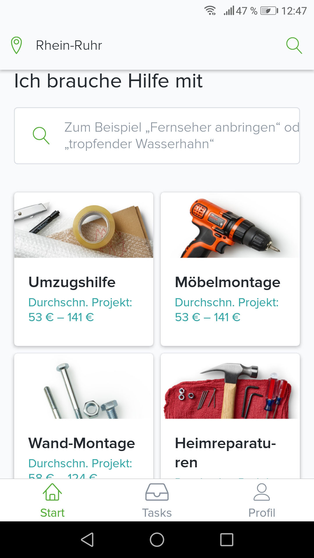 Nun können Sie eine der Kategorien auswählen: Umzugshilfe, Möbelmontage, Wand-Montage, Heimreparaturen oder Reinigung. Anschließend werden Sie aufgefordert, Ihren konkreten Auftrag zu beschreiben. Beispielsweise werden Sie beim Punkt Umzugshilfe nach Ort und geschätzter Arbeitszeit gefragt.