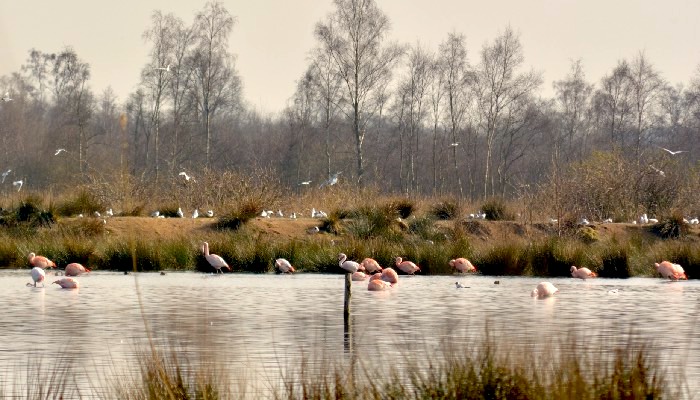 Unterwegs auf den barrierefreien und naturbelassenen Waldwegen weiß Wantia viel zu erzählen: Ob die Flamingos Zooflüchtlinge waren oder Privatpersonen oder Tierhändlern entwischt sind, wisse keiner genau. Jedenfalls sah man erste einzelne Flamingos in den 1970ern. Seit 1982 kommt eine jährlich größer werdende Gruppe.