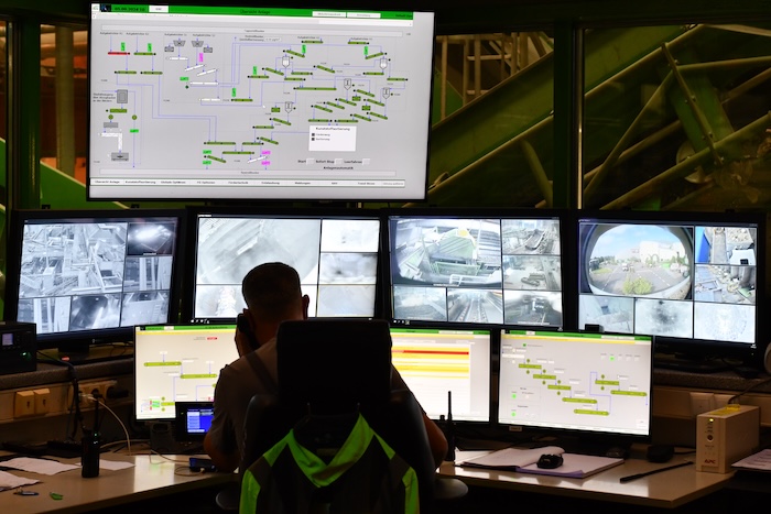 Alle Fäden laufen in der zentralen „Leitwarte“ zusammen. Hier beobachten Mitarbeitende über eine Vielzahl von Monitoren das Zusammenspiel aller Stationen. Sie können sich über Videokameras in unterschiedlichen Bereichen einen Einblick holen oder rufen ein Computerprogramm auf, das die Funktion und die Prozesse in Grafiken darstellt. Zwischendurch tauschen sie sich über Sprechfunk mit den Kollegen aus, die in der Anlage vor Ort sind, dann klingelt wieder ein Telefon. Gearbeitet wird hier in zwei Schichten, insgesamt 18 Mitarbeitende halten die Anlage am Laufen – außer nachts, da steht alles still.